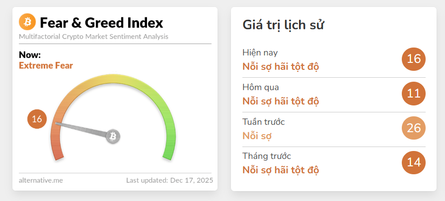 Dữ liệu từ Santiment được củng cố thêm khi Chỉ số Fear & Greed mới nhất của CoinMarketCap cho thấy tâm lý thị trường đang rơi xuống mức 16 (sợ hãi tột độ) — một trong những ngưỡng thấp nhất kể từ đợt đầu hàng vào tháng 11.