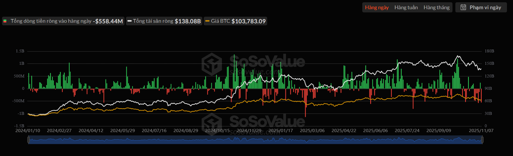 Vào ngày 7 tháng 11 (giờ ET), thị trường quỹ ETF tiền mã hóa tại Mỹ ghi nhận sự thay đổi đáng chú ý trong tâm lý nhà đầu tư. Các quỹ Bitcoin spot ETF chứng kiến dòng vốn rút ra mạnh, tổng cộng 558 triệu USD, khi cả 12 quỹ đều bị rút vốn và không có quỹ nào ghi nhận dòng vốn vào — cho thấy xu hướng chốt lời hoặc giảm rủi ro.