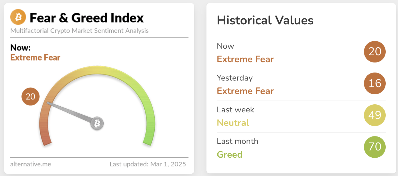 Chỉ số Sợ hãi và Tham lam của Bitcoin hiện ở mức 20 báo hiệu nỗi sợ hãi cực độ tính đến ngày 1 tháng 3 năm 2025.