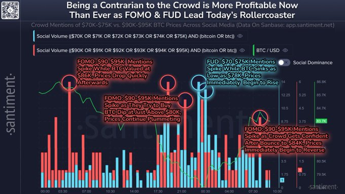Trong khi nỗi sợ hãi và lòng tham đang gia tăng, Santiment nhận thấy một mô hình rõ ràng: đám đông liên tục hiểu sai các động thái của Bitcoin.