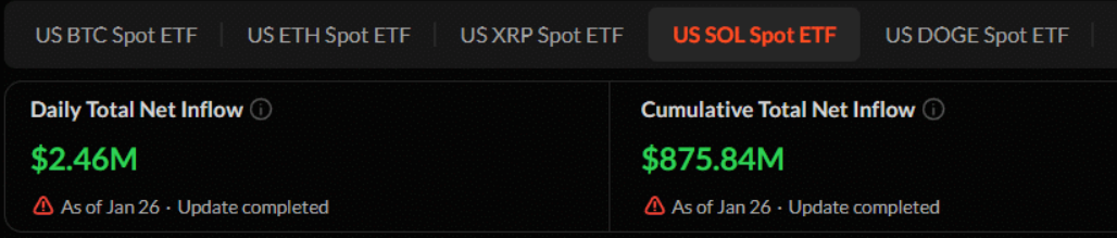 Bất chấp những bất ổn dai dẳng của thị trường, dữ liệu on-chain từ SoSoValue cho thấy giới đầu tư Phố Wall và các tổ chức lớn vẫn giữ vững sự quan tâm cũng như niềm tin đáng kể đối với các Solana ETF giao ngay. Theo thống kê, dòng vốn đã liên tục chảy vào các quỹ này kể từ ngày 16/1, cho thấy xu hướng tích lũy chưa hề suy giảm.