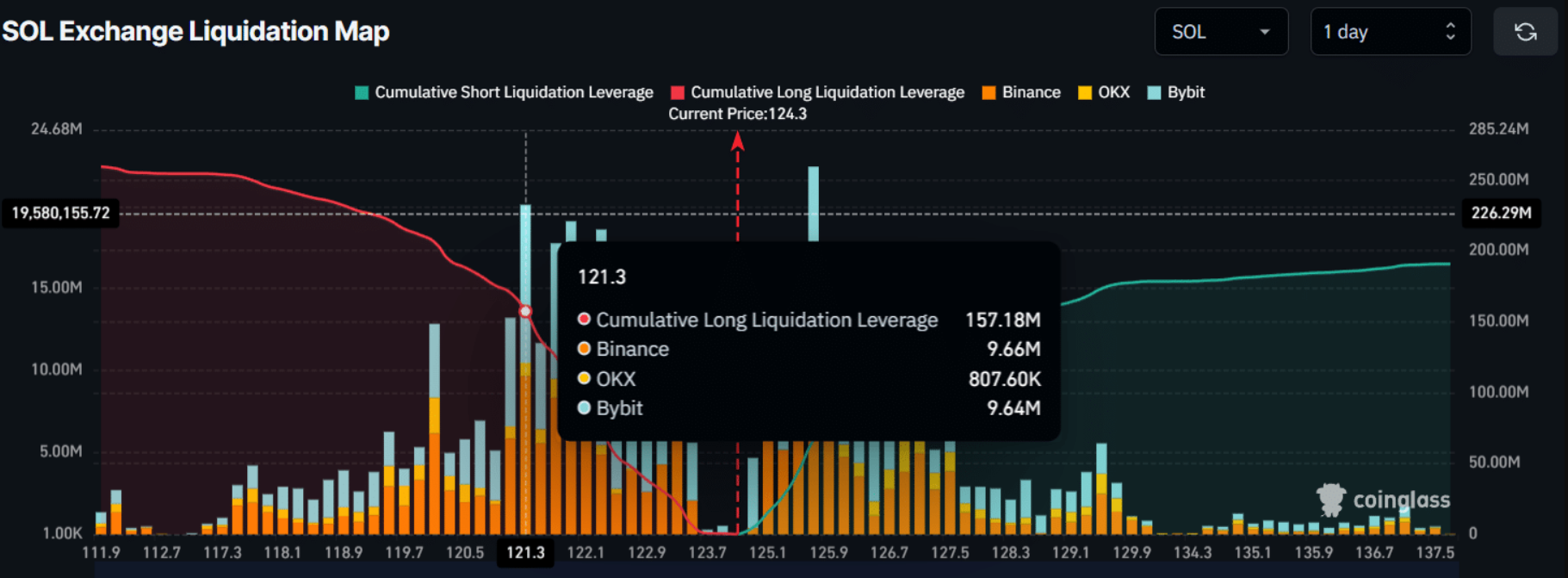 Các trader trong ngày dường như đang cùng chung quan điểm về một xu hướng giá tích cực. Dữ liệu từ nền tảng phân tích phái sinh CoinGlass cho thấy mức độ sử dụng đòn bẩy đang tập trung mạnh tại hai mốc then chốt: 121,3 USD ở chiều giảm và 125,7 USD ở chiều tăng.