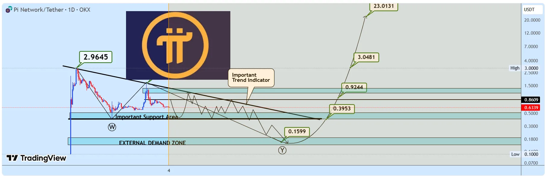 Một chuyên gia phân tích nổi tiếng trên TradingView, Weslad, đã chia sẻ những đánh giá của mình về tình hình hiện tại của Pi Coin. Ông nhận định rằng giá của Pi Coin đã giảm mạnh từ mức đỉnh 2,96 đô la và hiện tại đang có dấu hiệu hình thành một vùng cơ sở ở mức 0,38 đô la. Cấu trúc giá này cho thấy một “tam giác giảm dần”, một mô hình giá thường được coi là dấu hiệu của xu hướng giảm.