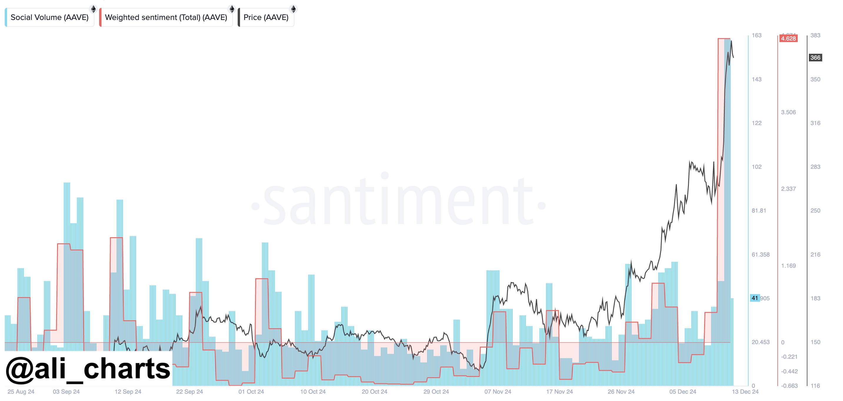 Chuyên gia giao dịch nhấn mạnh khối lượng giao dịch và tâm lý tích cực xung quanh token AAVE đang gia tăng mạnh mẽ. Tuy nhiên, ông cảnh báo rằng với sự tập trung ngày càng cao của cộng đồng vào AAVE, một đợt điều chỉnh ngắn hạn có thể sắp xảy ra, vì thị trường thường xuyên thay đổi theo xu hướng ngược lại với tâm lý đám đông.