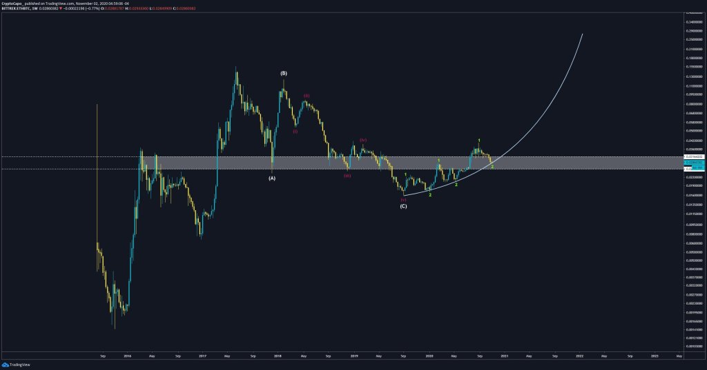 Dựa trên biểu đồ của Capo, ETH / BTC có thể đã kết thúc thị trường gấu kéo dài hai năm khi cặp này in các mức cao hơn và mức thấp hơn liên tiếp. Nếu cặp altcoin tuân theo kịch bản của Capo, nó có thể tăng vọt hơn 935% vào quý đầu tiên của năm 2022.