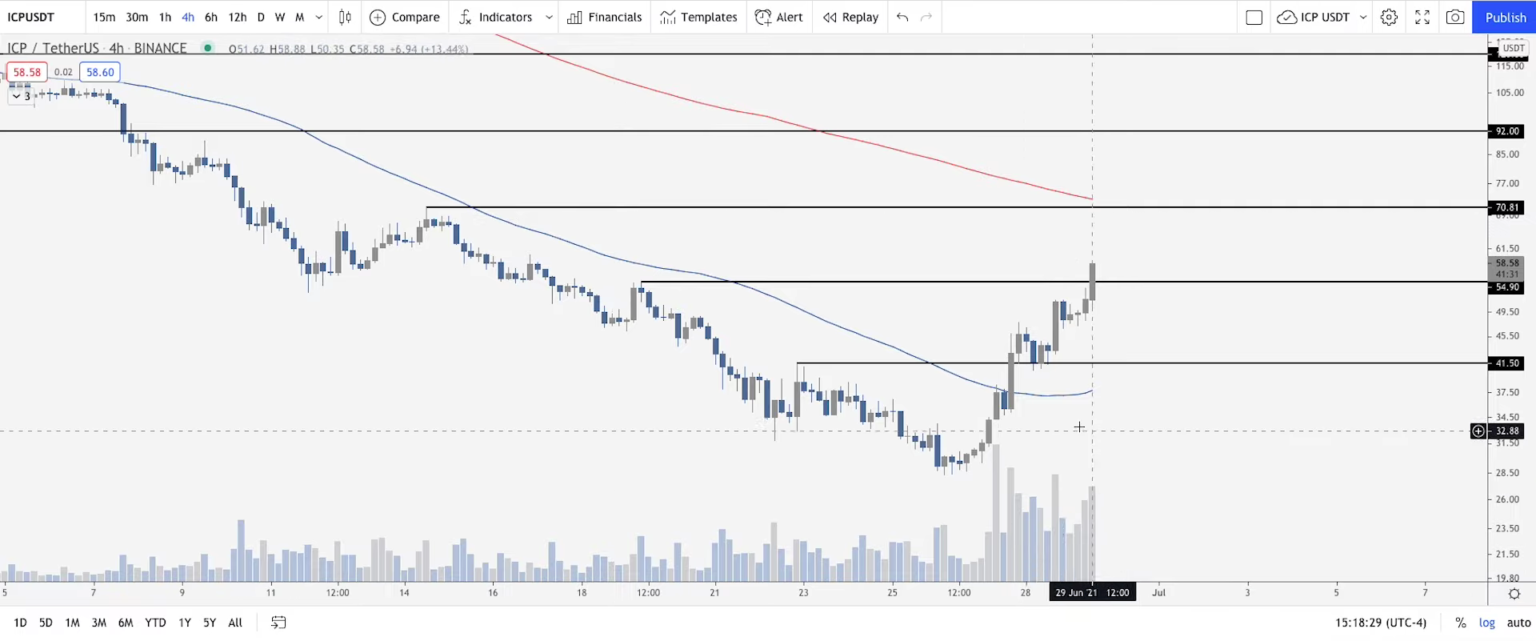 Một altcoin khác đã thu hút sự chú ý là ICP, token gốc của Internet Computer. Altcoin này đã và đang tăng lên trong thời gian gần đây. ICP vượt qua không phải chỉ 1 mà là 3 mức kháng cự trong vòng chưa đầy 5 ngày. Hỗ trợ cho hành động giá này là khối lượng mua rất cao. Hiện tại, ICP trị giá 44,84 đô la, nhưng Melker đã nói rằng nếu đợt tăng giá này tiếp tục, nó cũng có thể tăng lên 70 đô la.
