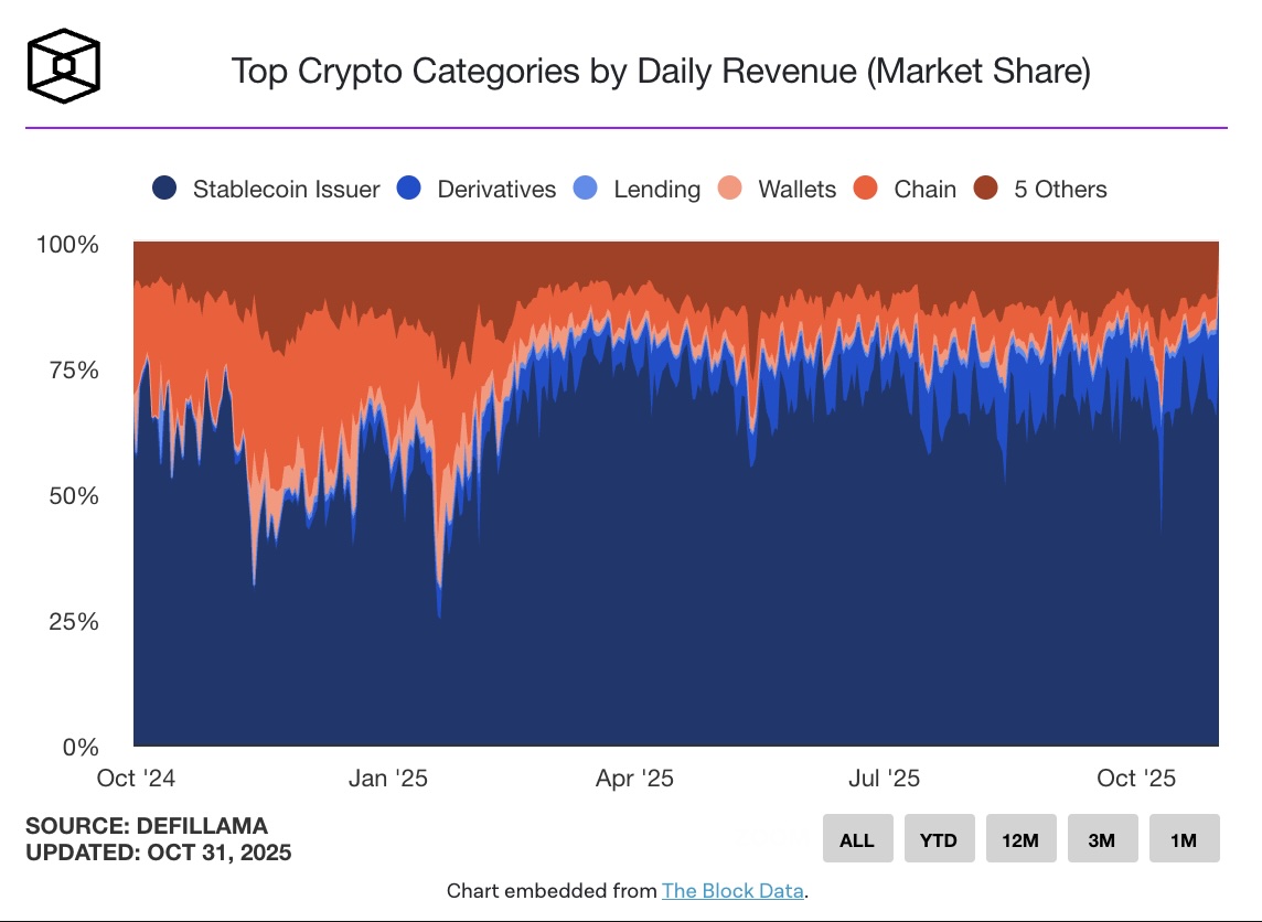 Các nhà phát hành stablecoin tiếp tục chiếm lĩnh phần lớn doanh thu trong lĩnh vực crypto, duy trì tỷ trọng từ 60% đến 75% tổng doanh thu hằng ngày trên nhiều mảng chính như nền tảng cho vay, sàn giao dịch phi tập trung (DEX), các vị thế nợ thế chấp (CDP) và hạ tầng blockchain.