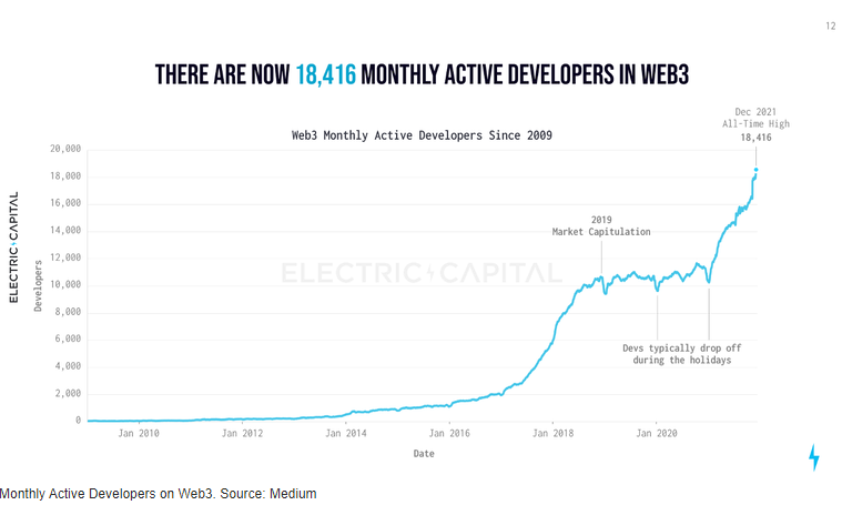 Một báo cáo gần đây của Electric Capital Developer cho thấy rằng ngày càng có nhiều nhà phát triển tham gia vào không gian công nghệ phi tập trung. Báo cáo năm 2021 cho thấy các hợp đồng thông minh trị giá 100 tỷ đô la đã bị khóa trong các nền tảng dự án Web.3.0.