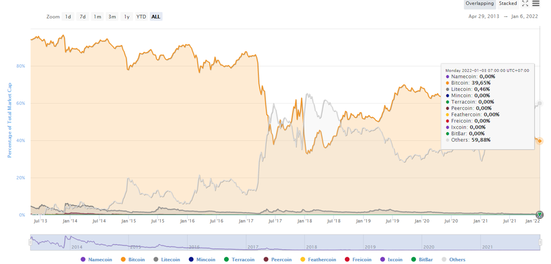Tuy nhiên, xu hướng này cho thấy thị phần của Bitcoin tiếp tục giảm vào năm 2022, có lẽ xuống thấp nhất là 10%, như một nhà phân tích dự đoán.