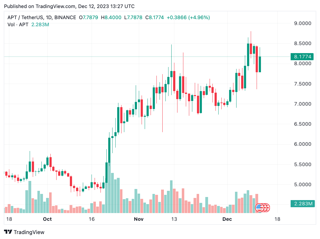 Token APT hiện giao dịch ở mức 8,17 đô la – tăng 4,4% sau khi mở khóa trong bối cảnh thị trường tiền điện tử nhìn chung tăng giá.