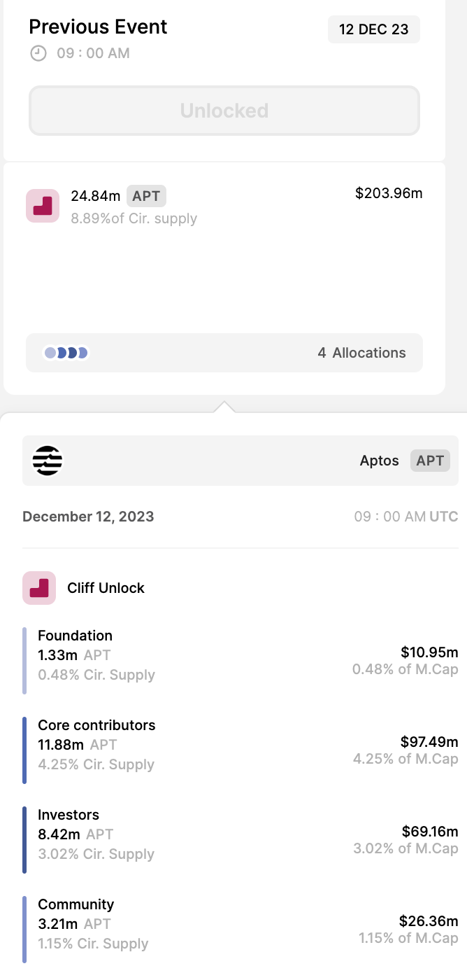 Phần lớn – khoảng 97,49 triệu đô la token được mở khóa – đã thuộc về những người đóng góp cốt lõi. Dữ liệu của TokenUnlocks cho biết 69,16 triệu USD đã được chuyển đến các nhà đầu tư, 26,36 triệu USD đã được chuyển đến cộng đồng và 10,95 triệu USD đã được chuyển đến Aptos Foundation.