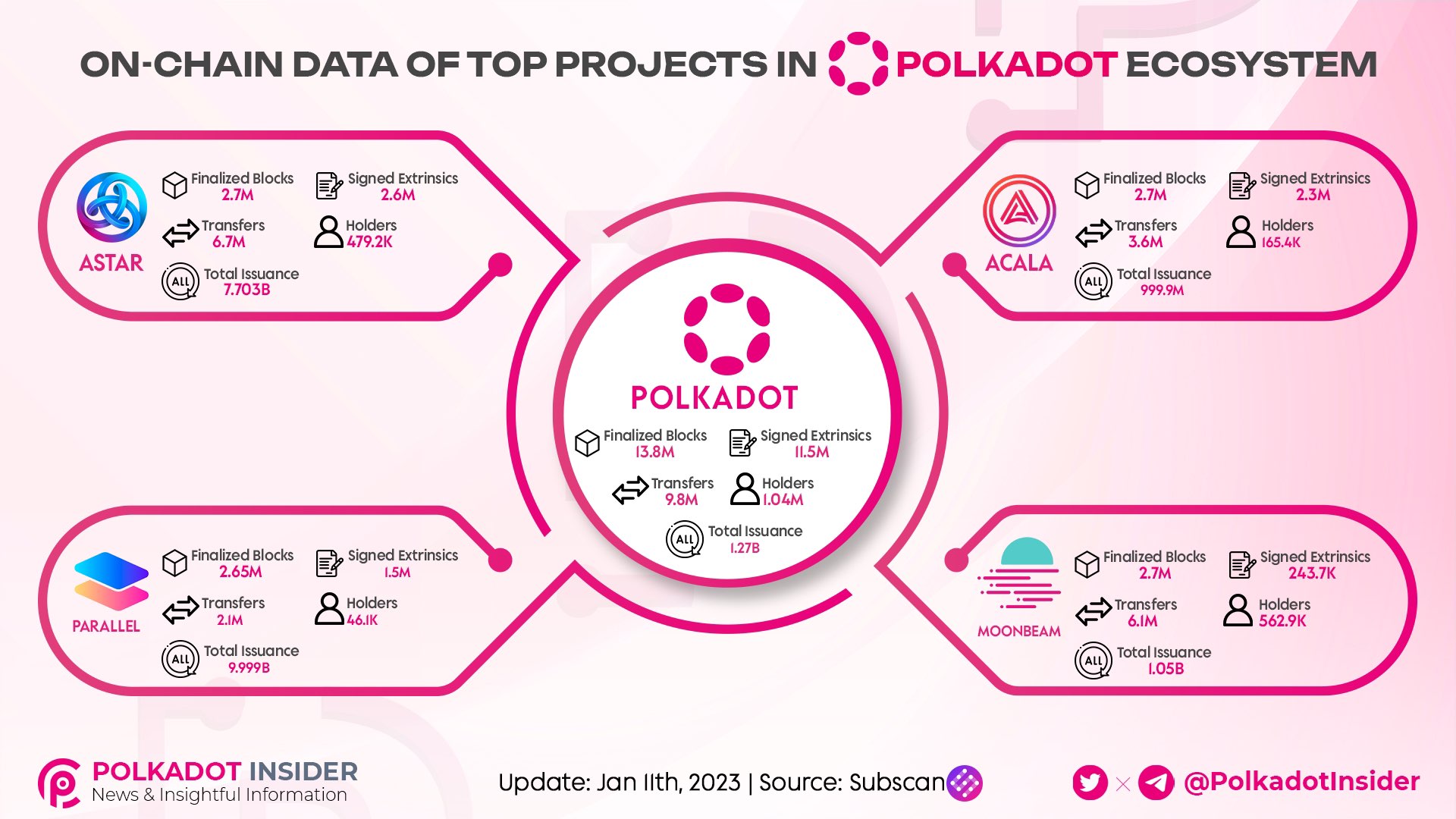 Polkadot Insider cũng đã công bố dữ liệu on-chain vào ngày 12/1, tiết lộ khá nhiều số liệu thống kê quan trọng về hệ sinh thái. Chẳng hạn, tổng số block đã hoàn thành đạt 13,8 triệu và tổng số lần chuyển sắp đạt 10 triệu.