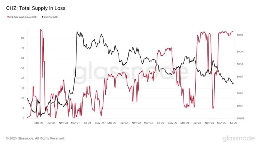 Hiện tại, khả năng sinh lời của các nhà đầu tư CHZ đang ở mức thấp đáng kể. Theo dữ liệu từ Glassnode, lượng token đang trong trạng thái thua lỗ đã chạm mốc cao kỷ lục – một tín hiệu cho thấy áp lực chốt lời gần như không còn.