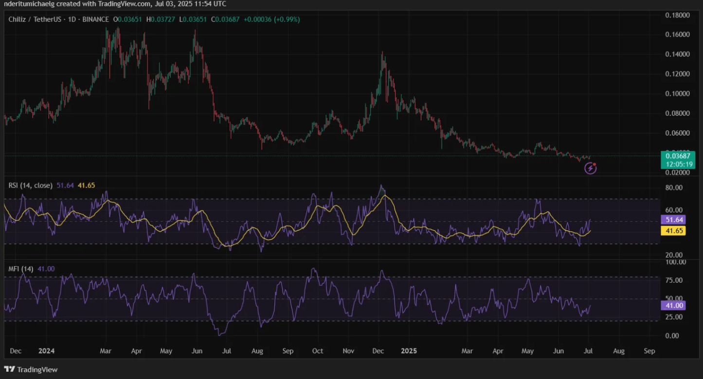 Tính đến thời điểm hiện tại, CHZ đang được giao dịch quanh mức $0,034 – tương đương mức giảm tới 73% so với đỉnh thiết lập hồi tháng 12/2024. Nếu so với đỉnh lịch sử, mức chiết khấu thậm chí còn sâu hơn, lên tới 96%, phản ánh mức sụt giảm cực mạnh trong dài hạn.