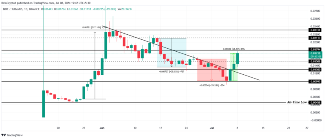 Giá Notcoin đã tăng 68% trong ba ngày qua, phục hồi 35% tổn thất được ghi nhận vào cuối tháng Sáu. Mục tiêu tiềm năng cho NOT là $0,0211, điều này sẽ yêu cầu vượt qua ngưỡng kháng cự ở mức $0,0179.