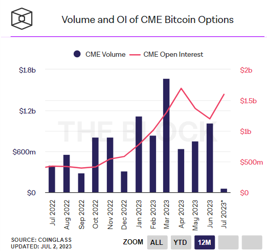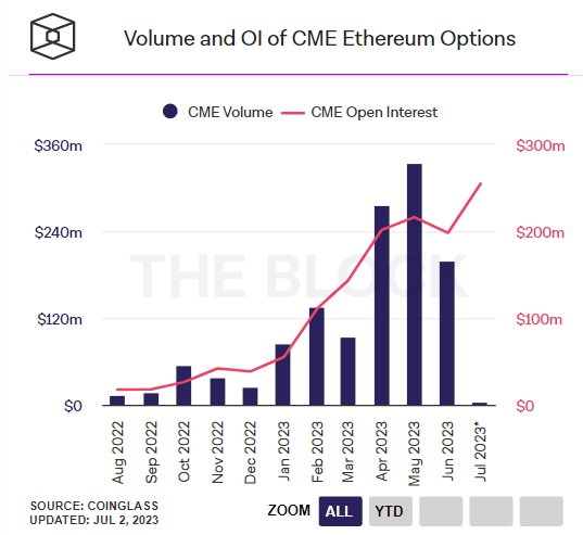 Hợp đồng mở (OI) đối với các hợp đồng quyền chọn ether của CME Group đang ở mức cao nhất mọi thời đại. OI – đề cập đến số lượng hợp đồng chưa thanh toán – đã đạt 254 triệu đô la vào tháng 6.