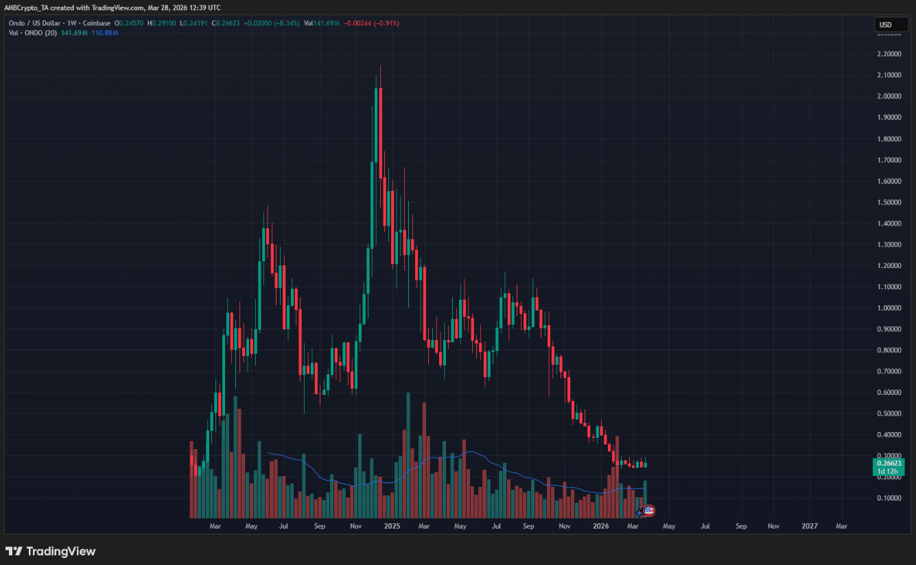 Dù vậy, xu hướng dài hạn của ONDO vẫn nghiêng về giảm. Biểu đồ tuần cho thấy áp lực bán mạnh bắt đầu từ tháng 10 đã có dấu hiệu hạ nhiệt vào tháng 2. Sáu tuần gần đây, giá chủ yếu dao động trong biên độ hẹp, phản ánh một giai đoạn tích lũy kéo dài.