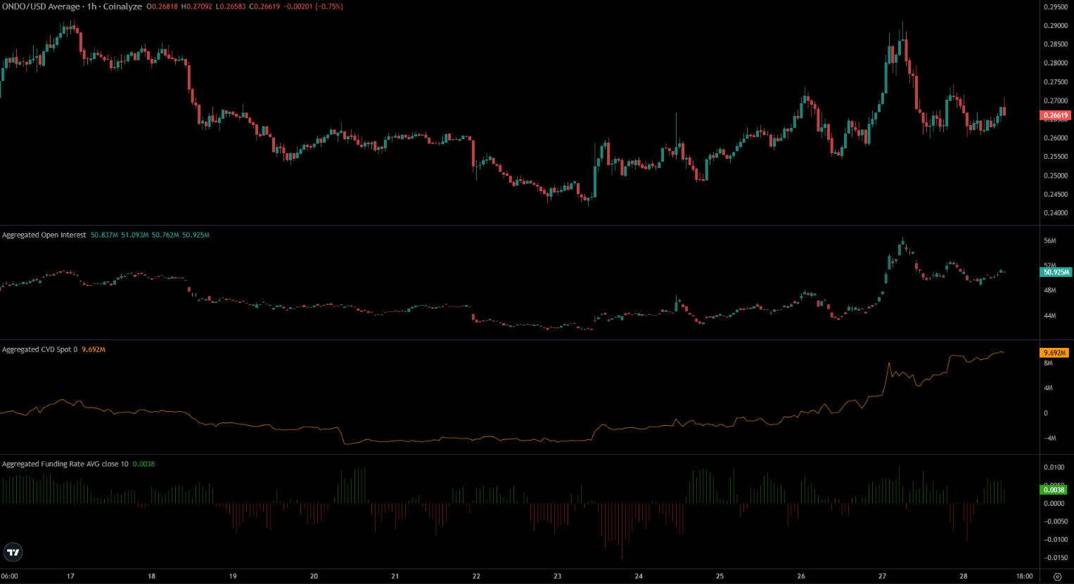 Dữ liệu từ Coinalyze cho thấy xu hướng tăng vẫn đang được duy trì, bất chấp nhịp điều chỉnh vào ngày 27/3. Hợp đồng mở gia tăng đều trong suốt tuần qua, đồng thời CVD giao ngay cũng đi lên, phản ánh sự đồng thuận giữa nhu cầu đầu cơ và lực mua thực đối với ONDO. Trong bối cảnh funding rate tiếp tục duy trì ở mức dương, động lực này có thể đưa giá tiến gần vùng đỉnh cục bộ quanh mốc $0,295.