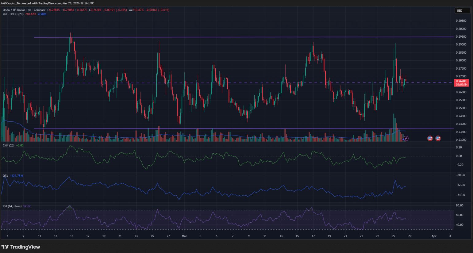 Hiện tại, ONDO đang dao động trong biên độ $0.,237–$0,295 và giao dịch quanh vùng trung tâm $0,266. Chỉ báo OBV ghi nhận xu hướng cải thiện rõ rệt trong những ngày gần đây, trong khi CMF vẫn nằm dưới ngưỡng 0, cho thấy dòng tiền vào chưa thực sự ổn định.