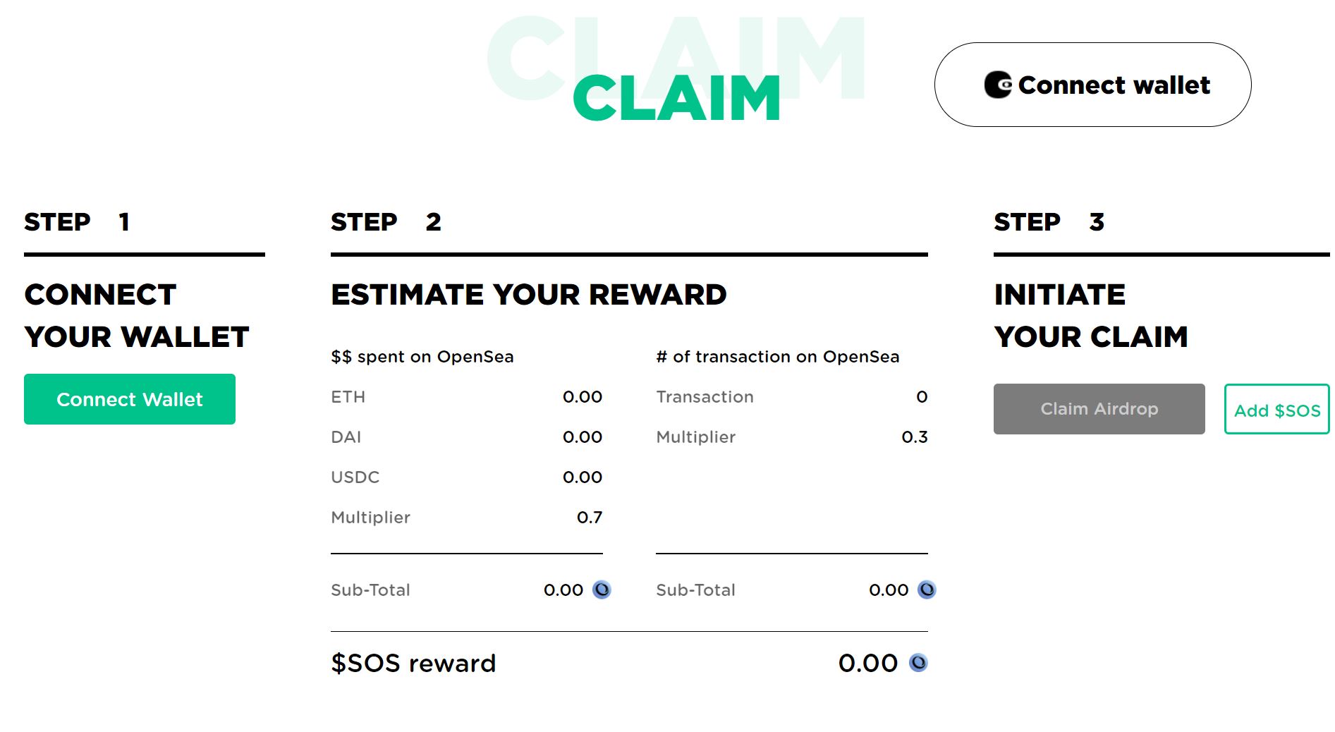Cụ thể, số lượng SOS airdrop sẽ dựa trên tổng số tiền điện tử (ETH, DAI, USDC) mà người dùng đã chi tiêu trên OpenSea trước đó nhân với hệ số 0.7 và cộng với số lượng giao dịch đã thực hiện trên OpenSea nhân với 0.3.