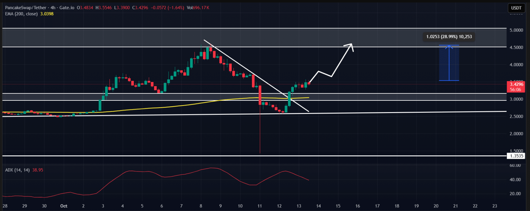 Ở khung 4 giờ, việc giá phá vỡ đường xu hướng giảm cho thấy động lượng đã nghiêng về phe bò. Nếu CAKE tiếp tục giữ vững trên vùng 3 USD, đồng coin này có thể tăng thêm khoảng 28%, hướng tới mốc 4,50 USD.