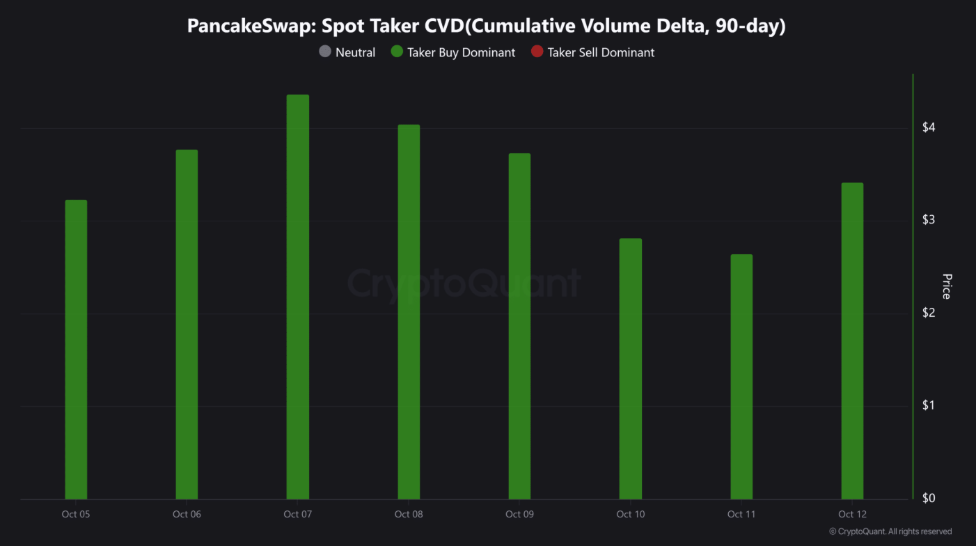 Theo chỉ báo Spot Taker CVD (Cumulative Volume Delta) từ CryptoQuant, hoạt động mua vào của CAKE đã duy trì mạnh mẽ suốt tuần qua, không hề xuất hiện một cột đỏ nào — cho thấy phe gấu gần như đã hoàn toàn đánh mất lợi thế trên thị trường.