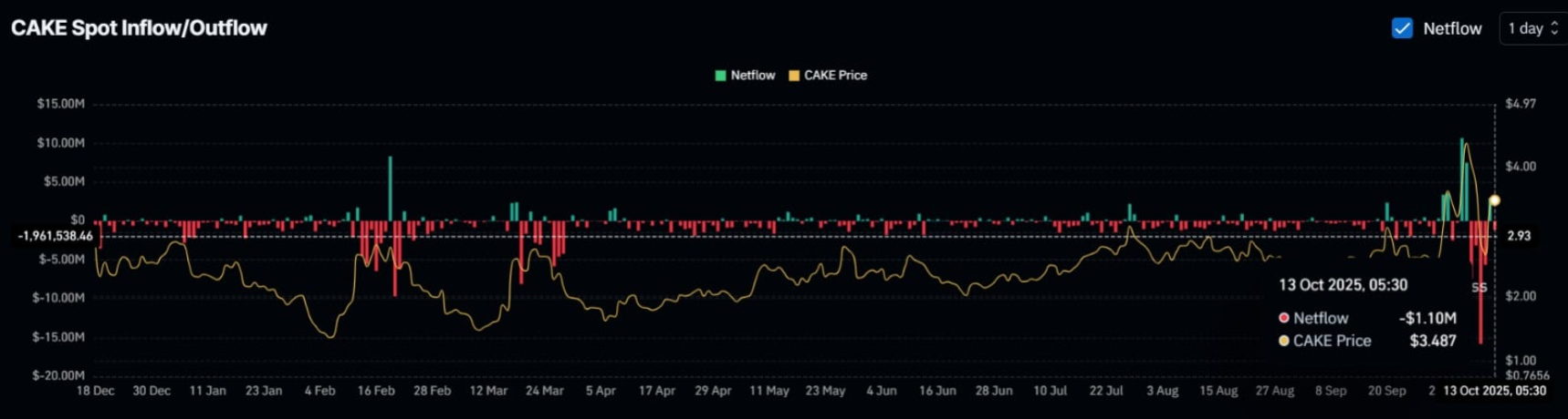 Sự kết hợp giữa dòng tiền rời khỏi sàn spot và hoạt động trên thị trường phái sinh cho thấy tâm lý nghiêng về phe bò, củng cố triển vọng tăng giá của CAKE.