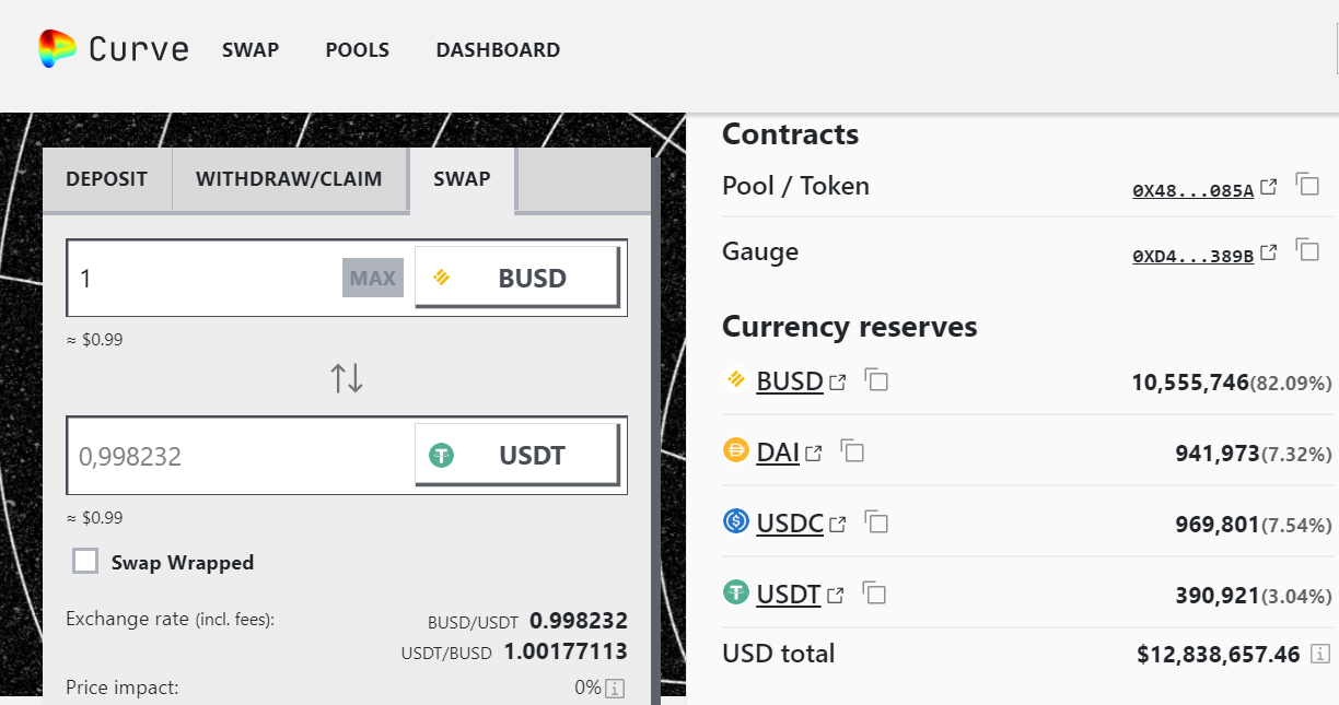Trong pool BUSD lớn nhất trên giao thức tài chính phi tập trung (DeFi) Curve, nơi các trader có thể swap giữa các stablecoin, các trader gần như đã cạn kiệt thanh khoản USDT, USDC và DAI. Giờ đây, 85% thanh khoản của pool là BUSD, khiến các trader gặp khó khăn khi trao đổi số lượng lớn BUSD và buộc người bán phải chấp nhận thua lỗ ở mức tỷ giá chiết khấu. Ở tỷ giá hiện tại, một trader đổi 10.000 BUSD sẽ chỉ nhận được 9.982 USDT.
