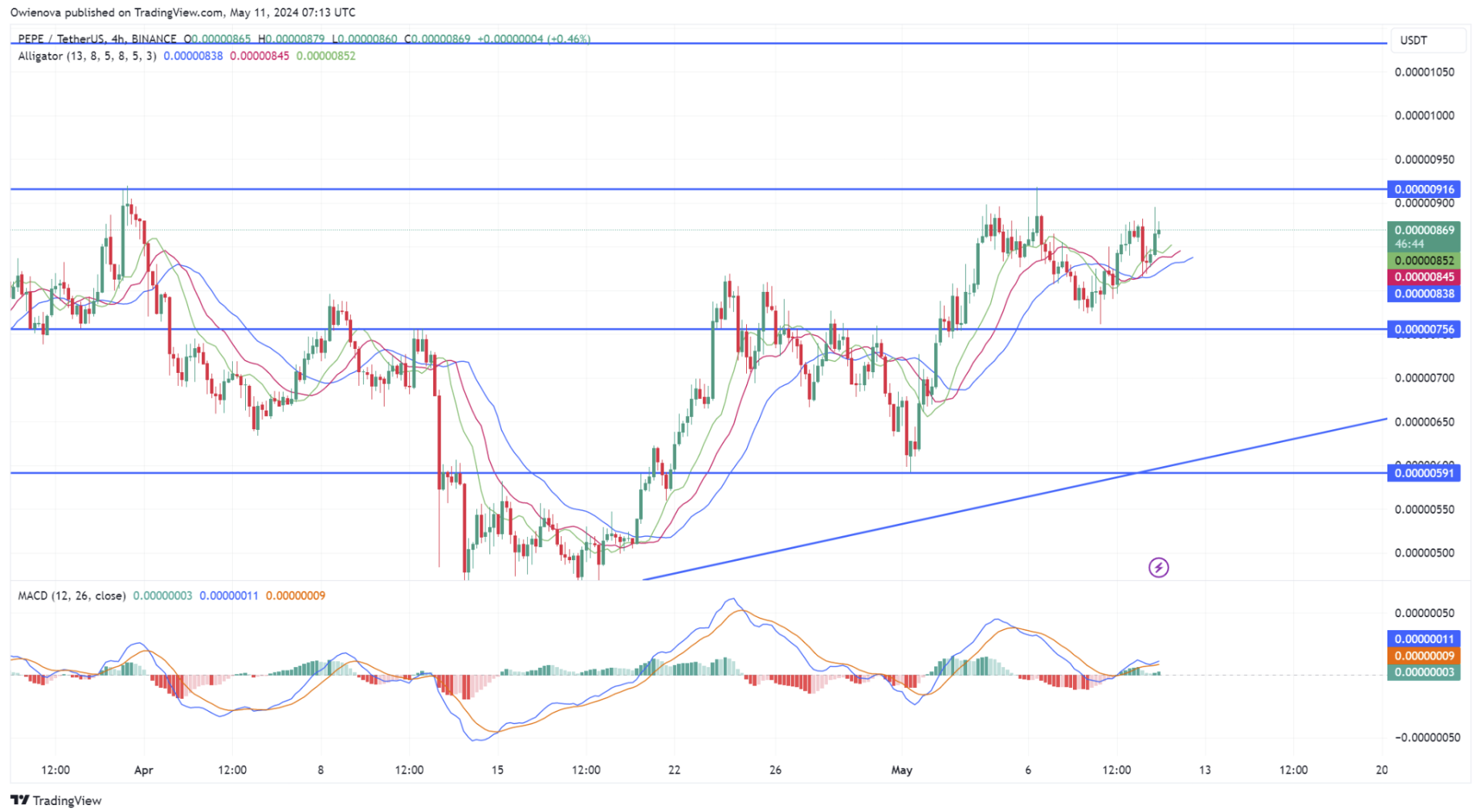 Hiện tại, giá PEPE đang tiến tới mức kháng cự 0,00000916 USD và nếu thành công vượt qua, giá có thể retest mức cao nhất mọi thời đại.