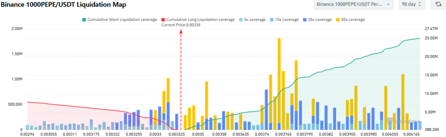 Tương tự Bitcoin, PEPE hiện cũng đang đối mặt với một cụm thanh lý vị thế short dày đặc ở phía trên. Dữ liệu từ bản đồ thanh lý trong 90 ngày cho thấy tổng giá trị đòn bẩy của các vị thế short vượt xa so với các vị thế long trên thị trường.