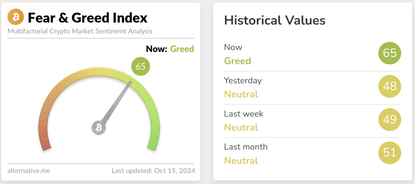 Chỉ số sợ hãi và tham lam của Bitcoin hiện đang ở mức 65, chỉ ra tâm lý tham lam trong thị trường. Chỉ số này đánh giá tâm lý thị trường dựa trên các yếu tố như biến động, khối lượng giao dịch và xu hướng truyền thông xã hội.