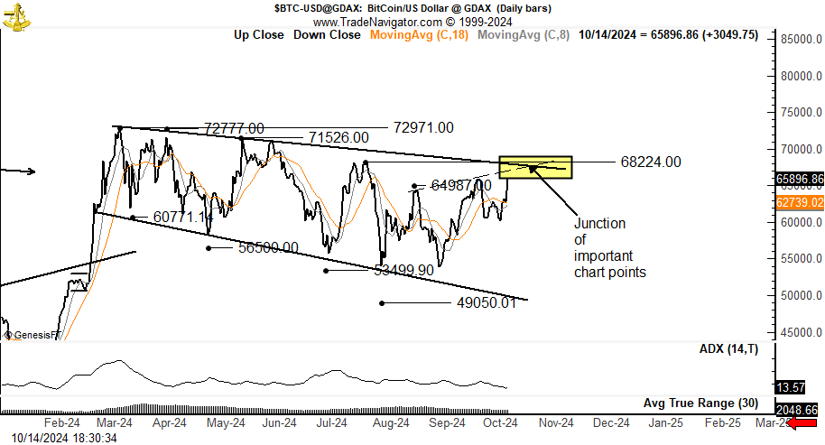 Trong một bài đăng X ngày 15 tháng 10, trader kỳ cựu Peter Brandt đã nêu bật một mức giá đóng vai trò là giao điểm của các điểm biểu đồ quan trọng đối với Bitcoin trong một mô hình mà trader gọi là tam giác mở rộng ngược (inverted expanding triangle), đó là 68.224 đô la (vùng màu vàng). Cho đến khi Bitcoin có thể vượt qua vùng này, giá sẽ tiếp tục đi ngang hoặc điều chỉnh giảm.