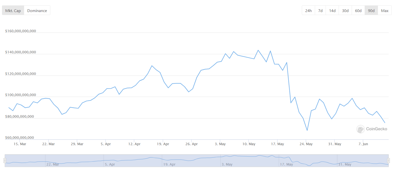 Giá Bitcoin sau đó giảm từ 64.000 đô la xuống còn 47.000 đô la trước khi bật trở lại phạm vi 53.000 – 60.000 đô la khi sự tự mãn bắt đầu xuất hiện. Đợt bán tháo vào tháng 5 đã đẩy thị trường đi qua các giai đoạn lo lắng, phủ nhận, hoảng sợ và đầu hàng cũng như phản ứng của hệ sinh thái đối với các dòng tweet của Musk, ngoài việc các lực lượng khác gây áp lực giảm giá lên thị trường, đã gây ra lượng lớn sự tức giận trong cộng đồng.