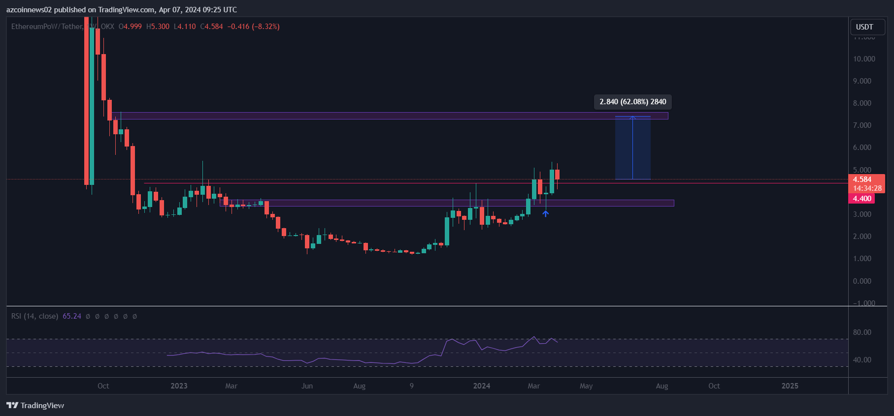 Triển vọng có khả năng xảy ra nhất cho thấy giá ETHW sẽ tiếp tục tăng trong thời gian tới. Mục tiêu gần nhất là $5,3 và cao hơn tới $7,4.
