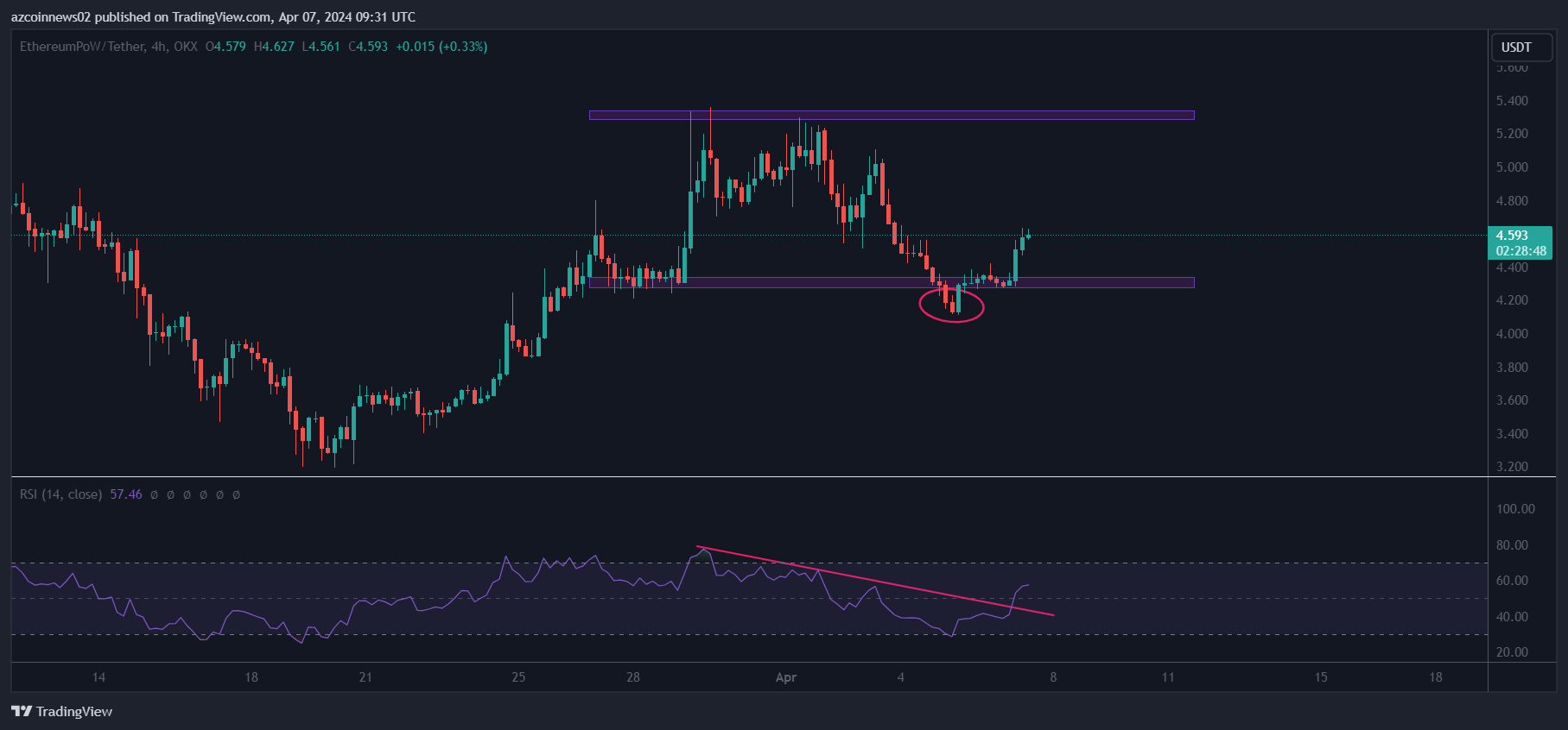 Biểu đồ 4 giờ cho thấy giá ETHW đã đòi lại vùng hỗ trợ ngang nhỏ ở $4,3 vào ngày hôm nay. Động thái này cho thấy sự cố được tạo vào ngày 5 tháng 4 chỉ là một độ lệch (elip màu đỏ), điều thường được theo sau bởi các đợt phục hồi mạnh.