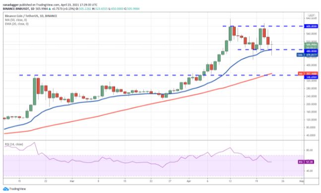 Binance Coin (BNB) đã giảm từ vùng kháng cự 600 – 638,56 đô la vào ngày 21 tháng 4, cho thấy phe gấu đang hoạt động ở các cấp độ cao hơn. Người bán đã kéo giá xuống dưới đường EMA 20 ngày (479 đô la) vào hôm qua nhưng không thể duy trì các mức thấp hơn.