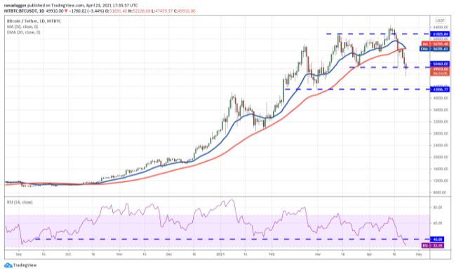 Đường trung bình động đơn giản (SMA) 50 ngày (tại 56.793 đô la) đã lật ngưỡng kháng cự và phe bò không thể đẩy, duy trì giá trên mức đó vào ngày 19 và ngày 20 tháng 4. Điều đó có thể đã dẫn đến việc các trader ngắn hạn chốt lời, kéo giá Bitcoin xuống dưới mốc tâm lý 50.000 đô la ngày hôm qua.
