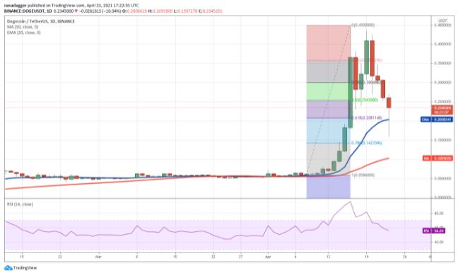 Trừ khi được hỗ trợ bởi các yếu tố cơ bản mạnh mẽ, các lần tăng giá theo chiều dọc sẽ kết thúc trong động thái lao dốc đột ngột và đó là những gì xảy ra với Dogecoin (DOGE). Altcoin này đã phá vỡ hỗ trợ EMA 20 ngày (0,2 đô la) vào hôm qua và giảm xuống 0,15 đô la, ngay trên mức thoái lui Fibonacci 78,6% tại 0,14 đô la.