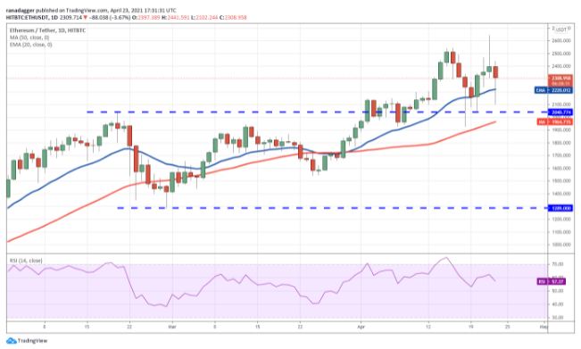 ETH đã phá vỡ trên 2.545 đô la vào ngày 22 tháng 4 và đạt mức cao nhất mọi thời đại mới là 2.645 đô la. Tuy nhiên, bấc dài trên nến hàng ngày cho thấy phe bò có khả năng duy trì breakout (bứt phá). Điều này có thể đã bẫy các trader tạm ngừng vị trí vào ngày hôm qua do tin breakout đã kết thúc.