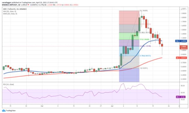 Thất bại của phe bò khi phục hồi từ đường EMA 20 ngày (1,22 đô la) vào ngày 21 tháng 4 cho thấy thiếu hụt người mua ở các mức cao hơn. Gấu đã chớp lấy cơ hội này và phá vỡ đường EMA 20 ngày vào hôm qua, kéo XRP xuống mức thoái lui Fibonacci 78,6% tại 0,86 đô la.