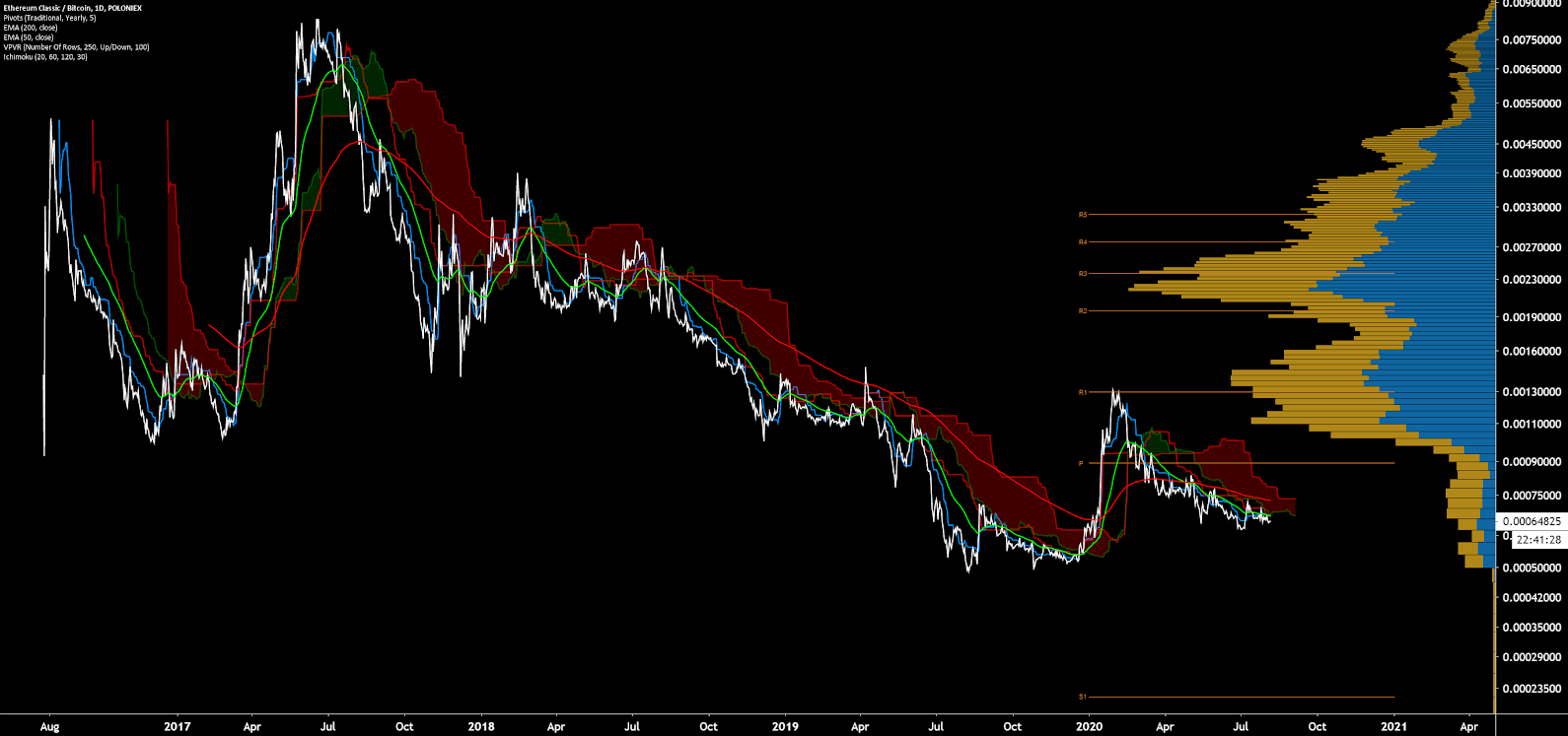 Cả cuộc tấn công 51% vào tháng 1/2019 và đầu tuần này dường như không có tác động đến giá ETC. Kể từ mức thấp tháng 12/2018, tài sản về cơ bản đã di chuyển phù hợp với thị trường tiền điện tử rộng lớn hơn. Lộ trình tiềm năng cho các biến động giá sắp tới có thể được tìm thấy trên khung thời gian cao bằng cách sử dụng các đường EMA, hồ sơ khối lượng, Pitchforks, biểu đồ và Ichimoku Cloud.
