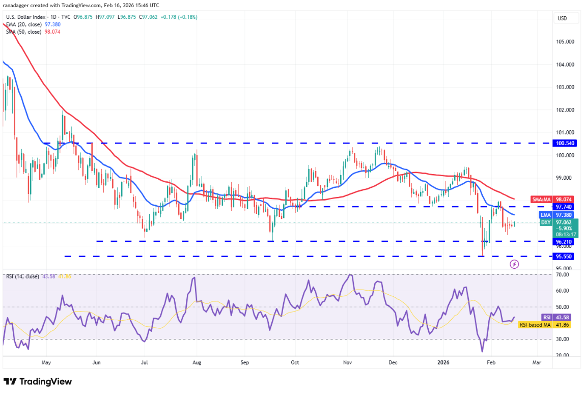 Chỉ số đô la Mỹ (DXY) đang giao dịch bên dưới các đường trung bình động, nhưng phe gấu vẫn chưa thể thử thách vùng hỗ trợ từ 96,21 đến 95,55.
