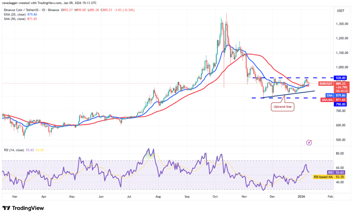 Đợt điều chỉnh của BNB từ mốc 928 USD đang nhận được hỗ trợ tại các đường trung bình động, cho thấy phe bò vẫn tham gia ở vùng giá thấp hơn.