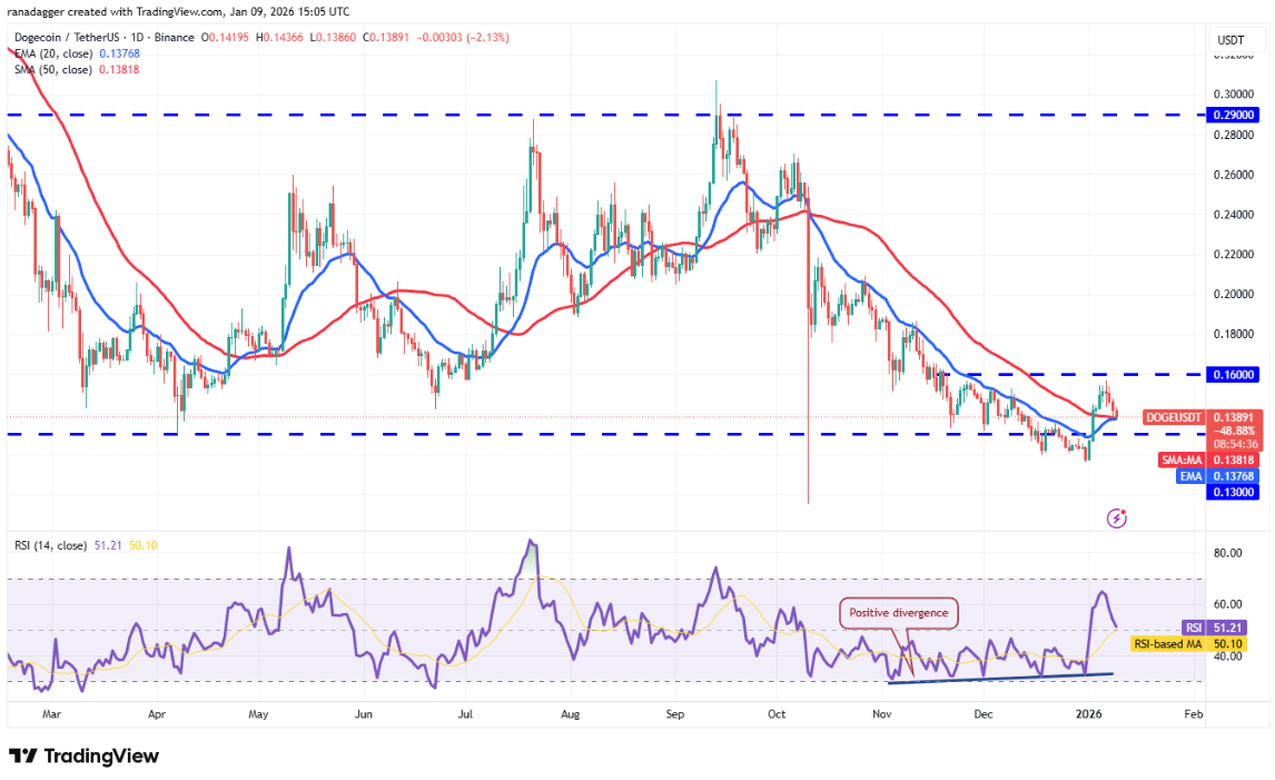 Đường EMA 20 ngày (0,14 USD) đang dần hướng lên, trong khi RSI nằm ngay trên mức trung tính, cho thấy người mua đang nhỉnh hơn đôi chút. Việc giá đóng cửa trên mốc 0,16 USD sẽ cho thấy thị trường đã bác bỏ cú phá vỡ xuống dưới vùng hỗ trợ 0,13 USD. Khi đó, cặp DOGE/USDT có thể tăng lên 0,19 USD.