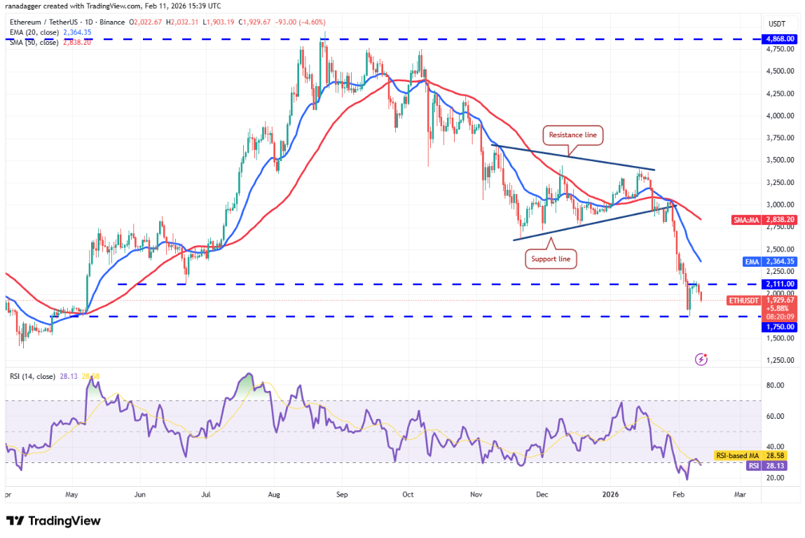 Ether đã quay đầu giảm từ 2.111 USD, cho thấy phe gấu đang quyết liệt bảo vệ vùng giá này.