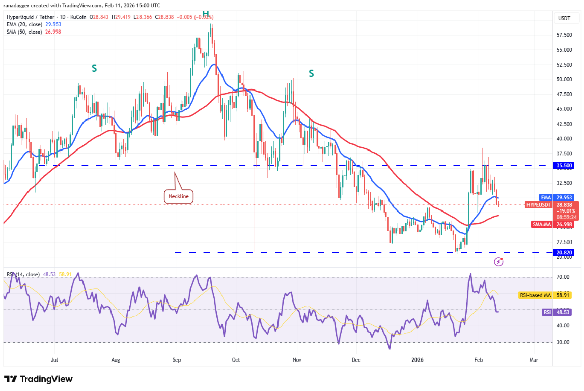 Hyperliquid (HYPE) đã tiếp tục giảm và rơi xuống dưới đường EMA 20 ngày (29,95 USD) vào thứ Ba, cho thấy phe bò đã suy yếu.