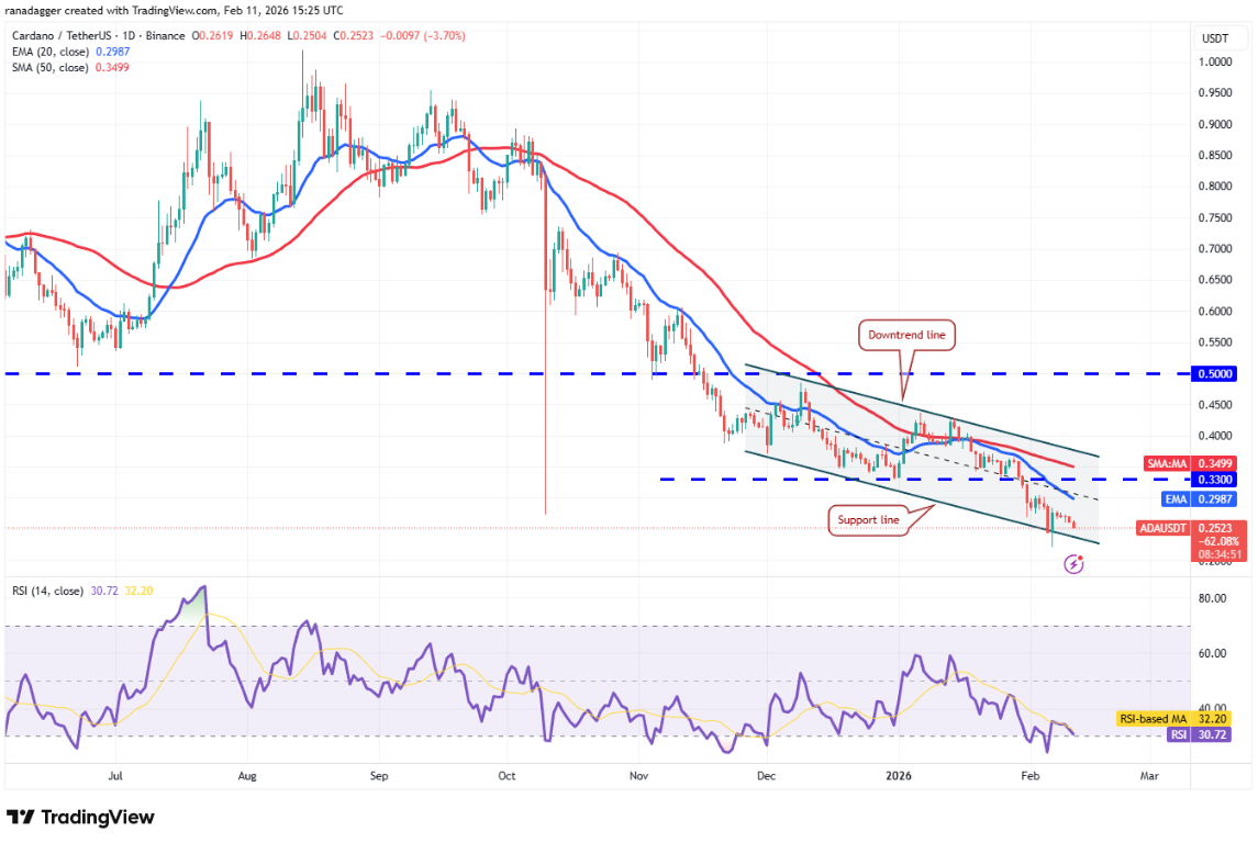 Cardano (ADA) đang dần trượt về đường hỗ trợ của mô hình kênh giảm dần, cho thấy phe gấu tiếp tục gây áp lực.