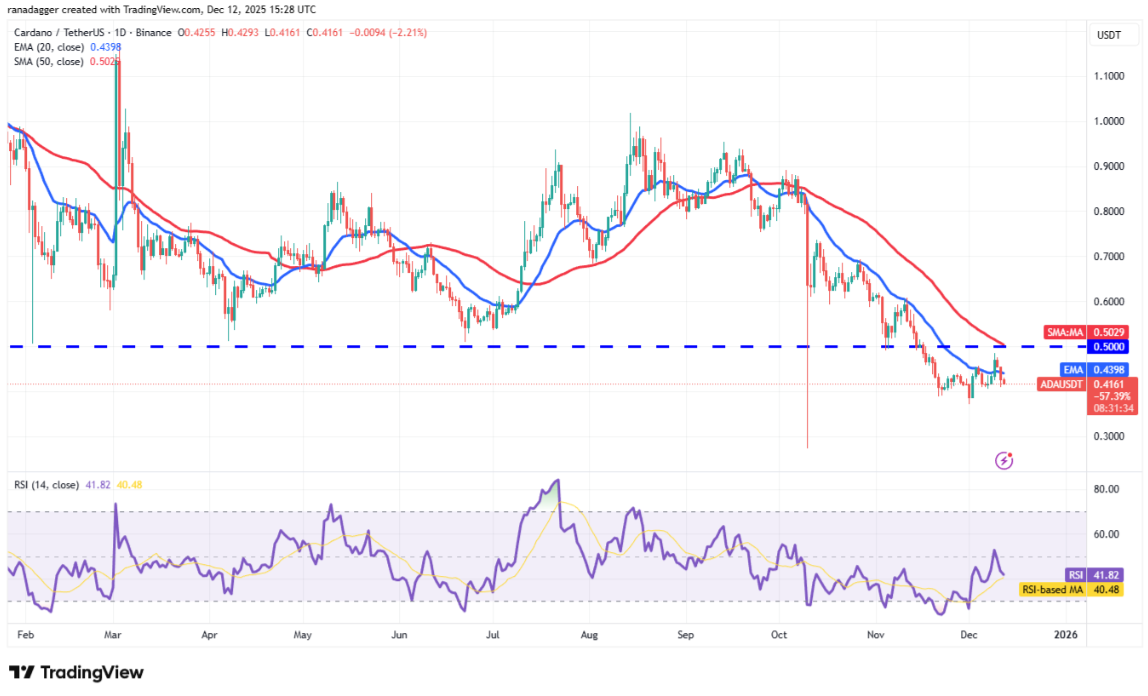 Đường EMA 20 ngày đi ngang tại 0,44 USD, cùng với RSI nằm trong vùng tiêu cực, cho thấy phe gấu đang chiếm ưu thế nhẹ. Các ngưỡng hỗ trợ nằm tại 0,40 USD, sau đó là 0,37 USD. Nếu phe gấu kéo giá xuống dưới 0,37 USD, cặp ADA/USDT có thể giảm mạnh về 0,31 USD, và thậm chí là đáy trong ngày 10/10 tại 0,27 USD.