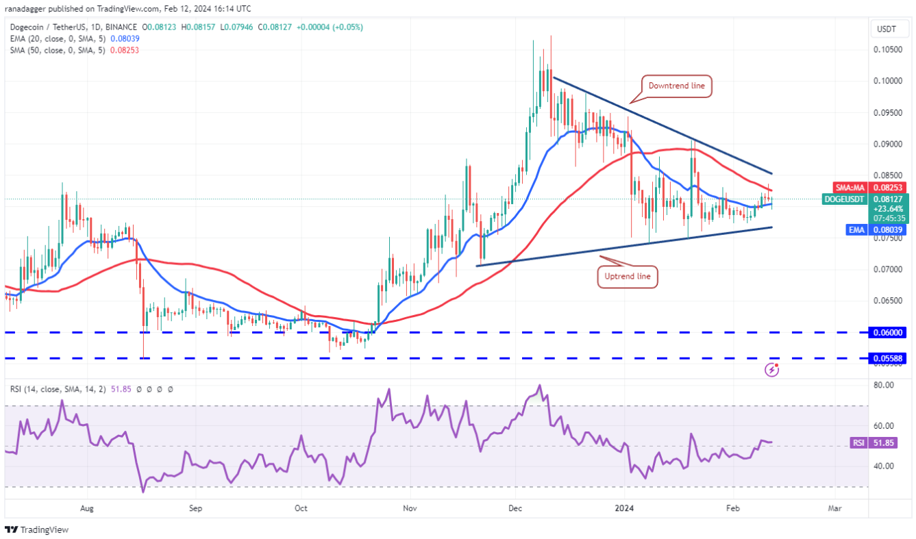 Đường EMA 20 ngày ($0,08) đã đi ngang và chỉ số RSI nằm gần điểm giữa, cho thấy sự cân bằng giữa cung và cầu. Người mua sẽ phải đẩy giá lên trên hình tam giác để chiếm thế thượng phong. Sau đó, cặp DOGE/USDT có thể cố gắng tăng lên vùng kháng cự $0,10-$0,11.
