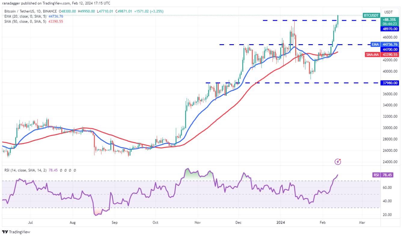 Bitcoin đã vượt lên trên mức cao nhất ngày 11 tháng 1 ở $48.970, cho thấy sự bắt đầu chặng tiếp theo của xu hướng tăng vào ngày 12 tháng 2.